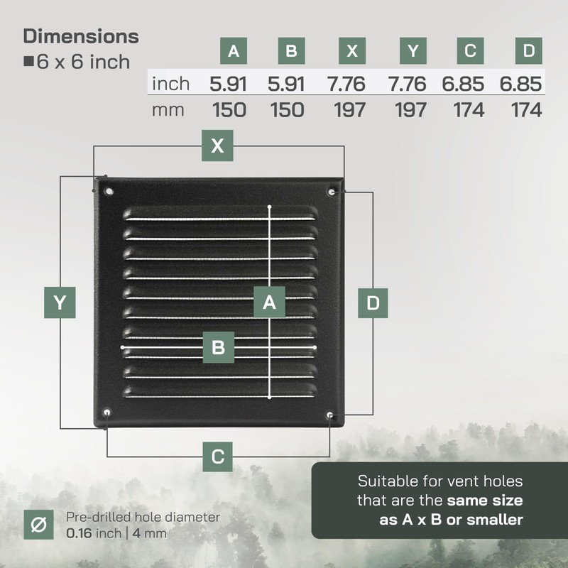 • Opening dimensions: 5.9 x 5.9 Inches. Outer dimensions: 7.68 x 7.68 Inches. Ideal for room exhaust and intake ventilation use.