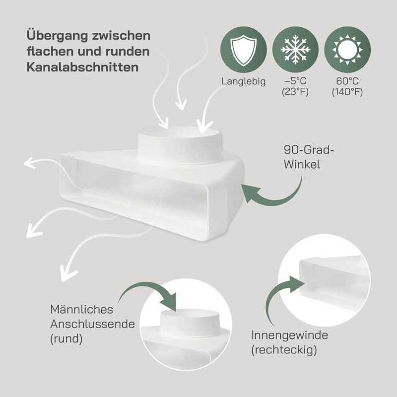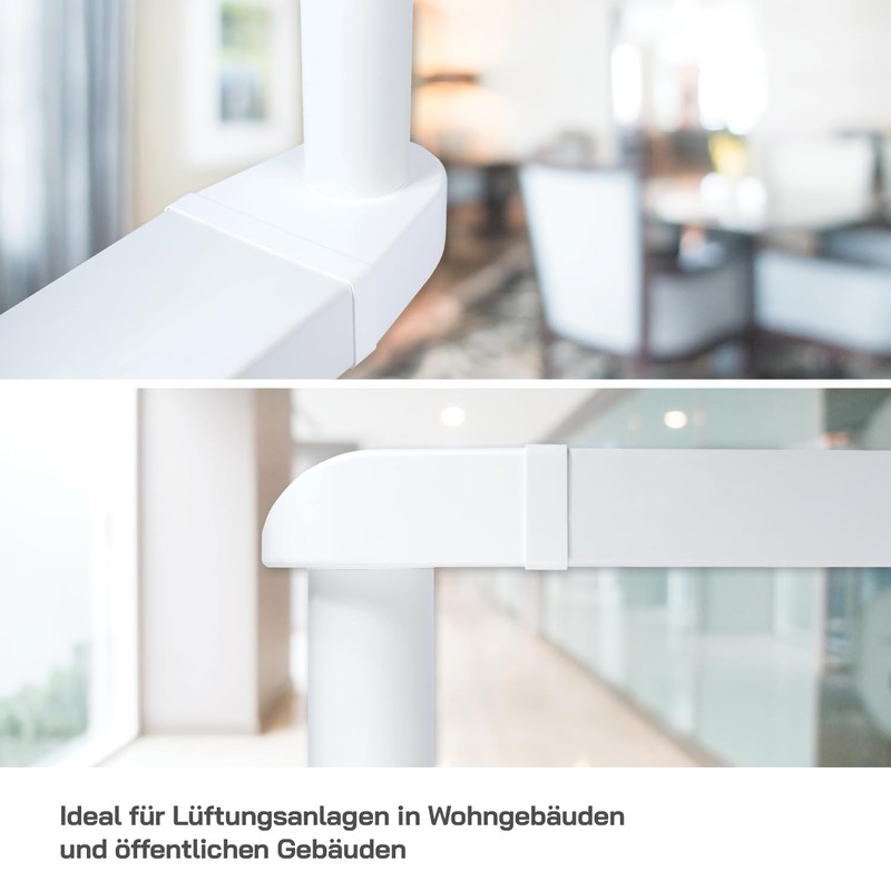 - Connector for rectangular ducts and round channels at a 90 degree angle. Colour: white