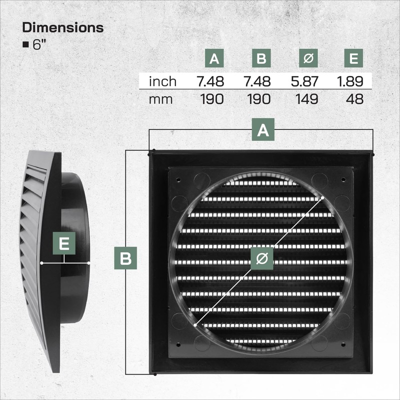 - External dimensions: 190 x 190 mm. Tube dimensions: diameter 150 mm. Dimensions between screw holes - 140 x 140 mm. Can be used as a grill cover, outlet cover and vent deflector. Perfect for DIY enthusiasts