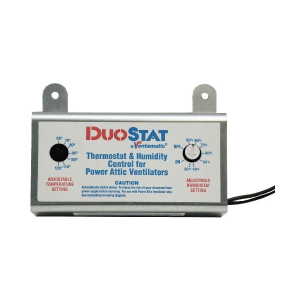 - THERMOSTAT/HUMIDISTAT CONTROL: The Dual Thermostat and Humidistat is designed for use with Power Attic Ventilators. The dual controls allow for a user to limit the operation of the fan based on user selected temperature and humidity levels.