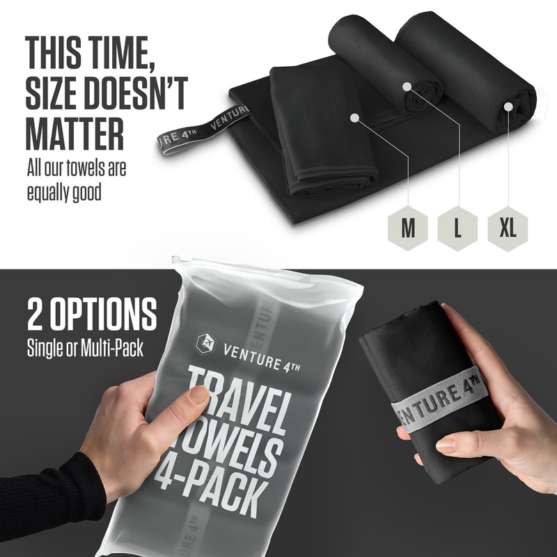 VENTURE 4TH - 4pcs Quick Dry Towels. Microfiber Travel Towels. Lightweight & Fast Drying Travel Towels for Body. Compact & Easy to Pack - 4 Pack Black Large