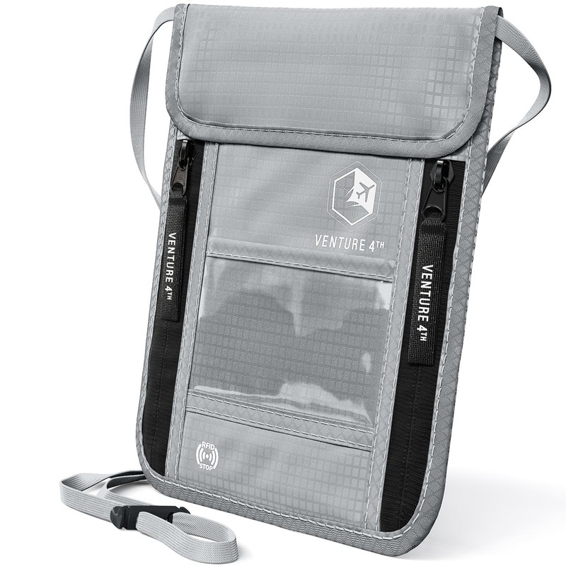 VENTURE 4TH Neck Wallet, RFID Blocking Passport Holder for Travel – Hidden Neck Pouch with 6 Compartments, Slim Lightweight Organizer with Adjustable Strap for Cash, Cards & Passport (Silver)