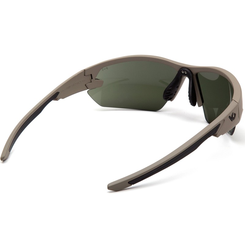 Adjustable custom-fit rubber nosepiece. Non-slip, flexible, co-injected temples. Passes ballistic MIL-PRF-32432 high velocity impact standards. Includes microfiber cleaning bag.