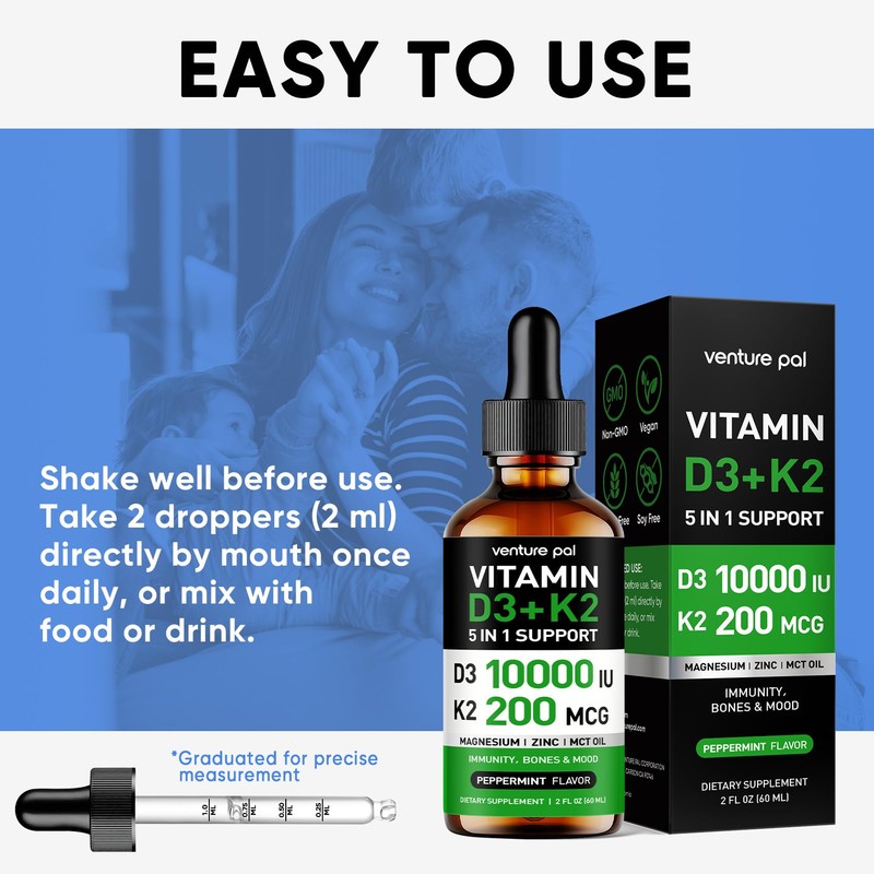 Venture Pal 10,000 IU Vitamin D3, 200 mcg K2 (MK-7) Drops with Magnesium and Zinc and MCT Oil | Supports Healthy Bones, Mood Balance, Immune | Mint Flavored High-Potency Supplement (2 Fl Oz)