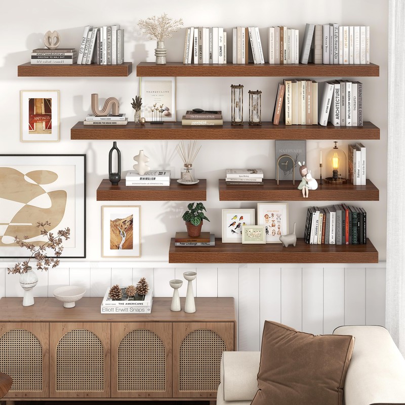 - STYLE & VERSATILITY: Enhance your home decor with our wall shelving, designed to be arranged side by side or staggered. Whether you prefer a modern or traditional aesthetic, large long walnut floating shelves for walls complement any style effortlessly.