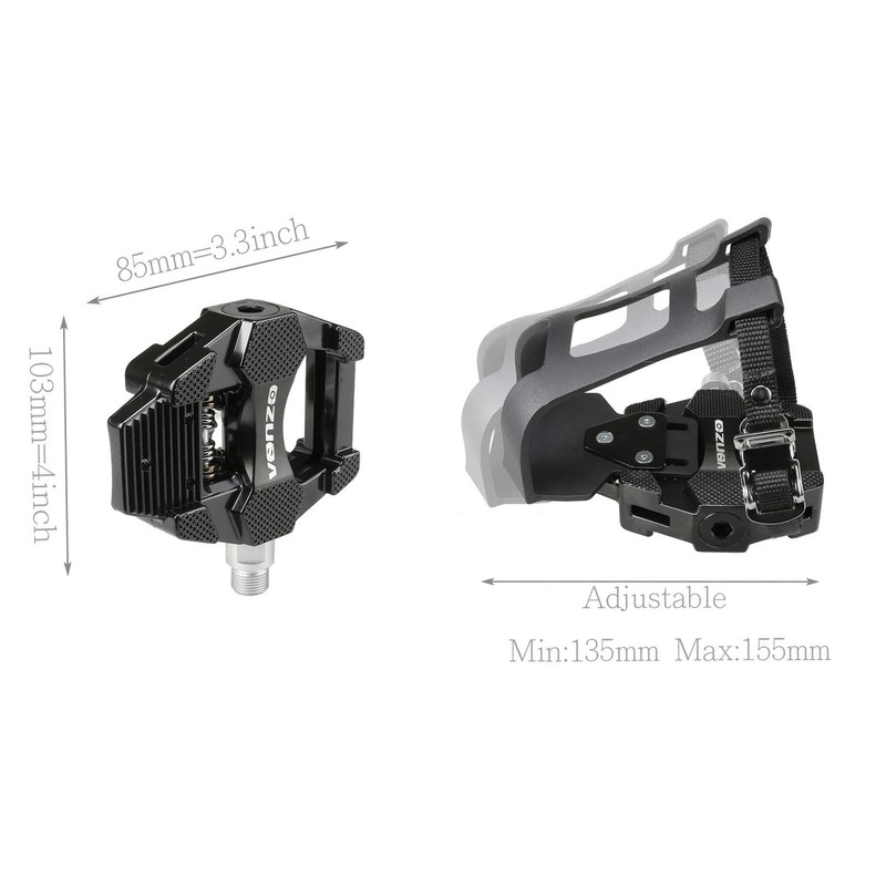 - ADJUSTABLE CAGE POSITION: The only spin bike pedals come with adjustable toe clip position. The max adjustment range is 15mm. It will always give riders very optimized riding position no matter how big feet the riders have. Size: 103 x 85 mm. Axle thread: 9/16".