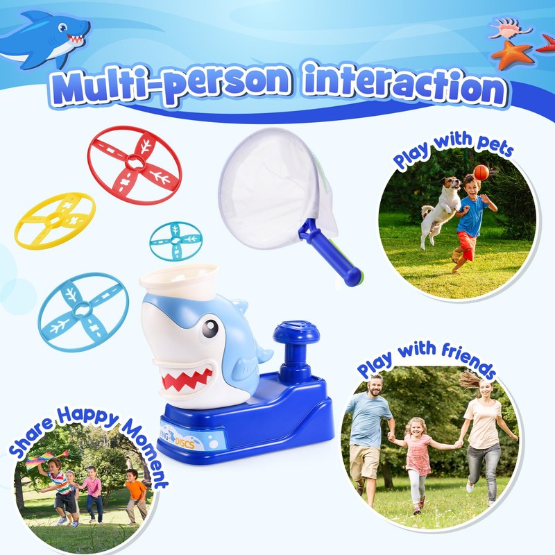 - 【Shark Outdoor Toys】:Shark Flying disc launcher toy sets itself apart from conventional rocket toys for kids and propeller toys. Experience a new level of fun with "Catch the Flying Disc". Contains Shark launcher*1,Fishing net *2 ,darts *8 ,mask *1. It's a fun game full of creativity and innovation.
