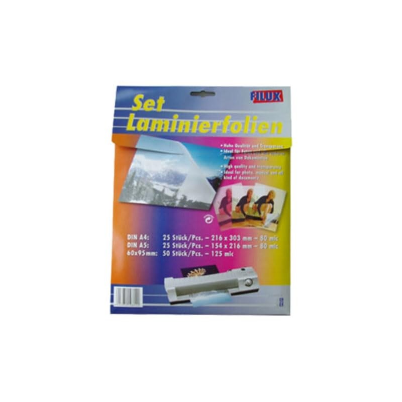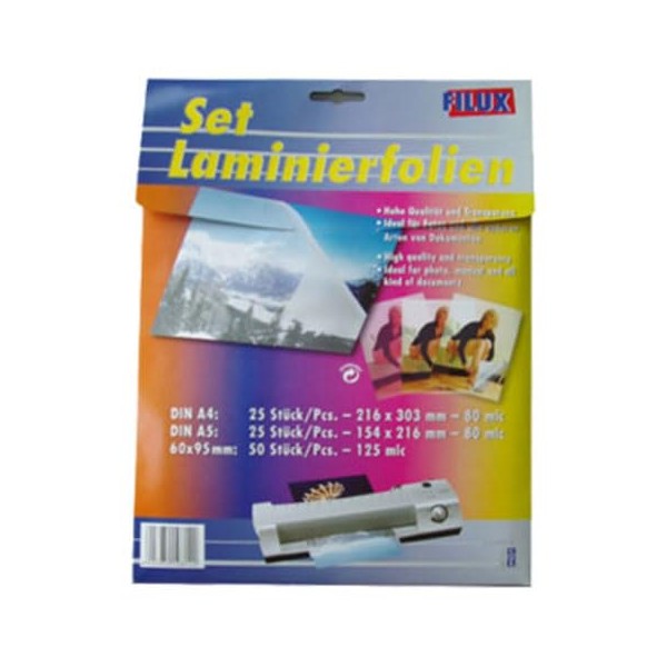Filux laminating pouches set A4, A5 and business card size, 100 pieces.