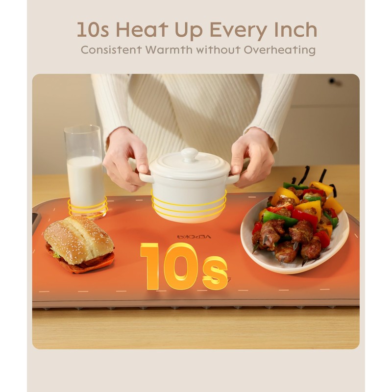 - Energy-Efficient & Versatile: Certified with multiple safety qualifications, VEPOKA silicone electric warming tray consumes only 0.25 kWh at high heat, reducing electricity while maintaining exceptional performance. This warming mat for food effortlessly heats various containers and supports a wide range of materials. Whether you're hosting a dinner party or simply keeping your meal warm, its compatibility with diverse cookware ensures seamless and efficient heating every time.