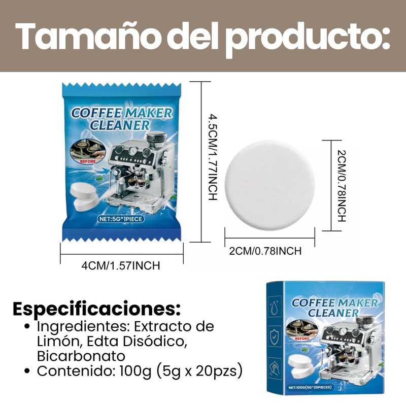 • Mantén tu máquina de café en condiciones óptimas con nuestras pastillas de limpieza especializadas. Este pack incluye 20 tabletas diseñadas específicamente para limpiar y mantener tu cafetera, asegurando que el sabor y el aroma de tu café no se vean comprometidos por residuos y olores no deseados. Gracias a su potente fórmula, estas pastillas eliminan eficazmente los restos de café, aceites y suciedad acumulada en las partes internas de la máquina, contribuyendo a una experiencia de café fresca y deliciosa cada vez.