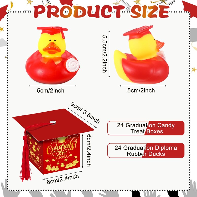 - Elaborate Combination for Graduation Celebration: with our package, you will receive 24 sets of graduation gifts made up of 24 beautifully designed and lifelike graduation boxes, with 2 styles of graduation rubber ducks included, 12 pcs of each style; These multiple colors and patterns allow you and your students to celebrate this memorable occasion in style, enough for you to share them with others