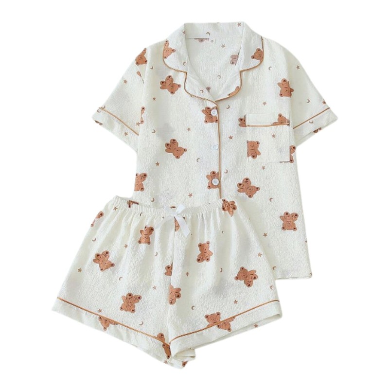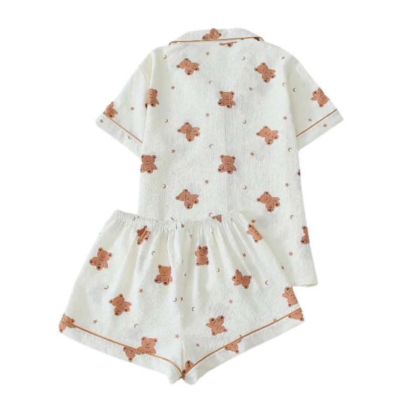 Verdusa Women's 2 Piece Pajama Set Lightweight Summer Pajamas Cute Pjs Sets Sleepwear Button Up Lounge Sets, Apricot Bears, Large
