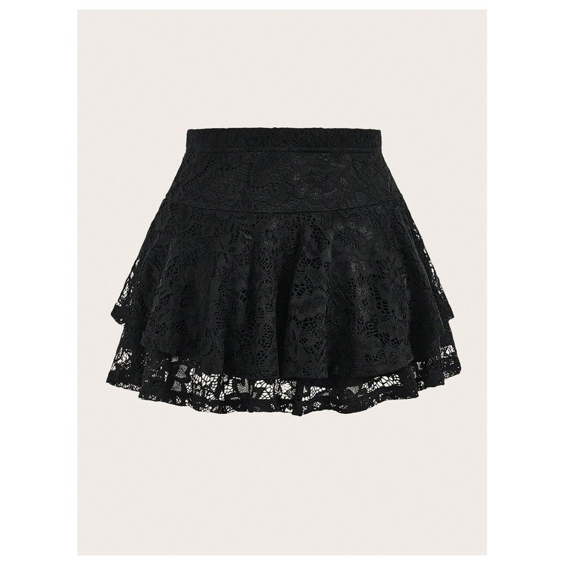 Verdusa Women's Plus Size Floral Lace Mini Skirts High Waist Pleated Ruffled Swing A Line Skirt Black 1XL