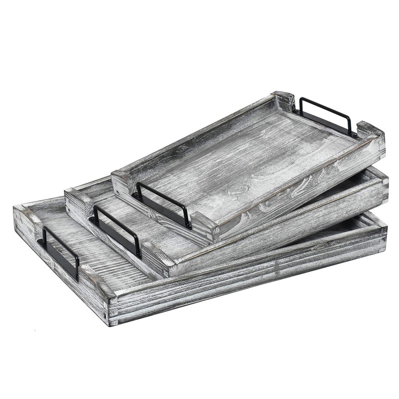 VERGOODR Country Rustic Torched Wood Nesting Breakfast Serving Trays with Handles, Set of 3 (white Grayish)