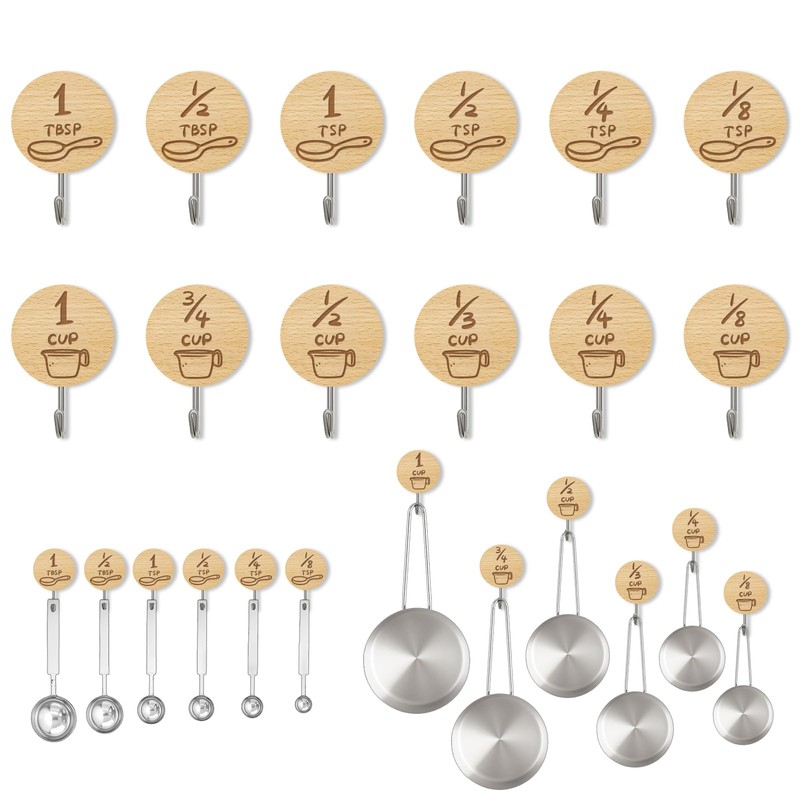 - Package Contents: The 12 wooden hooks are specifically designed to hang common measuring spoons and cups, including 1 tablespoon, 1/2 tablespoon, 1 teaspoon, 1/2 teaspoon, 1/4 teaspoon, 1/8 teaspoon, 1 cup, 3/4 cup, 1/2 cup, 1/3 cup, 1/4 cup and 1/8 cup.