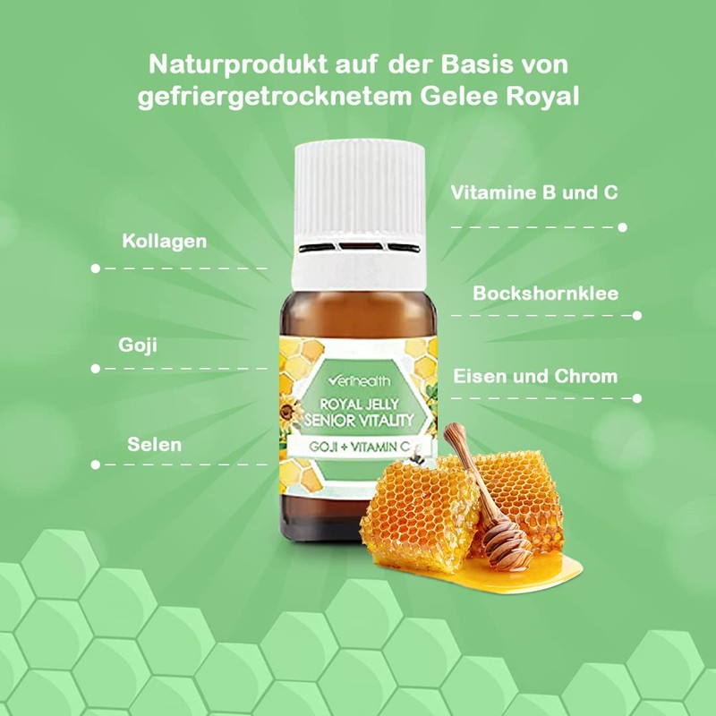 - Composition: a natural product based on freeze-dried Royal Jelly, a nutrient-rich ingredient that ensures energy and well-being. It also contains collagen that improves joint health, GOJI, Selenium, vitamins B and C as antioxidants and nerve regulators as well as PHENOGREW and CHROMIUM that regulate appetite