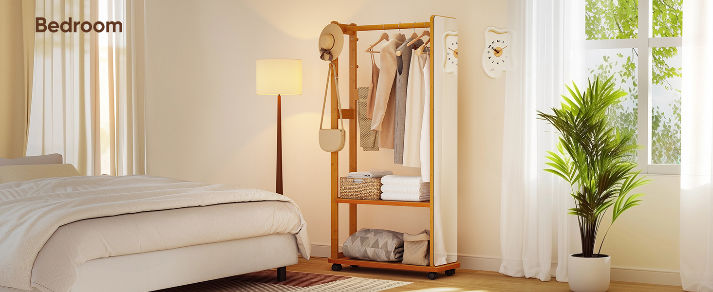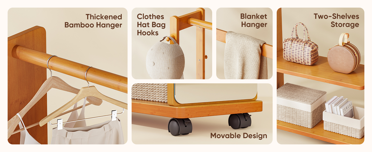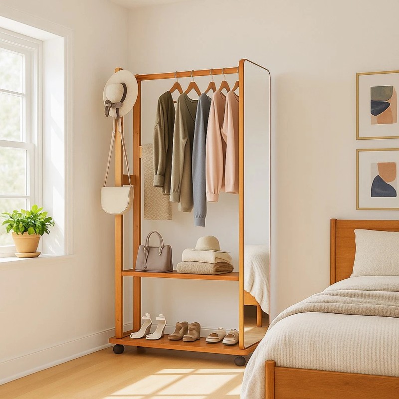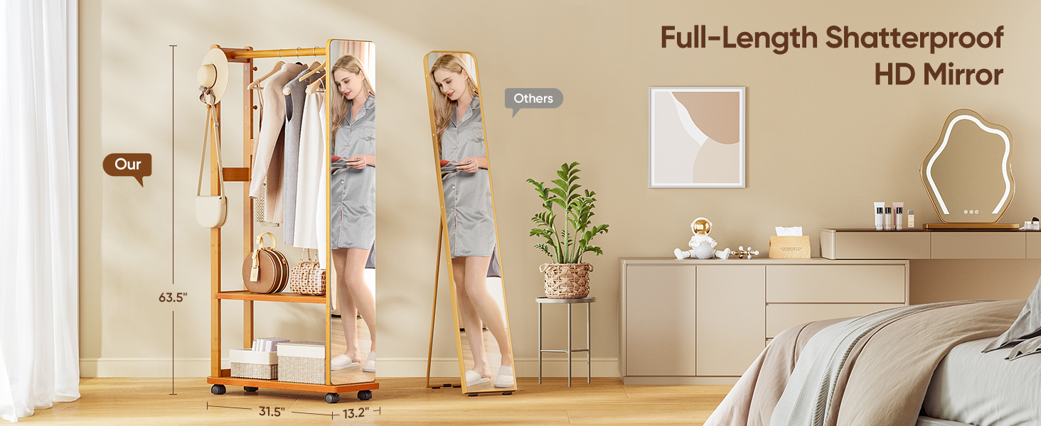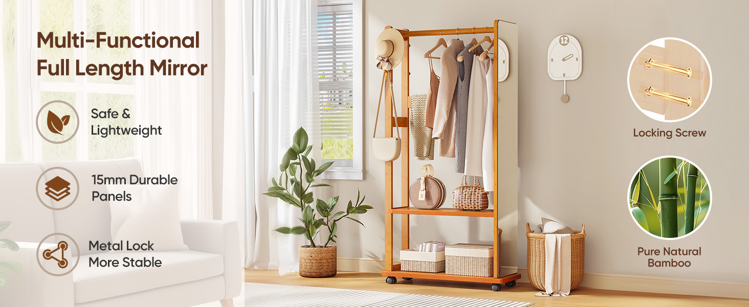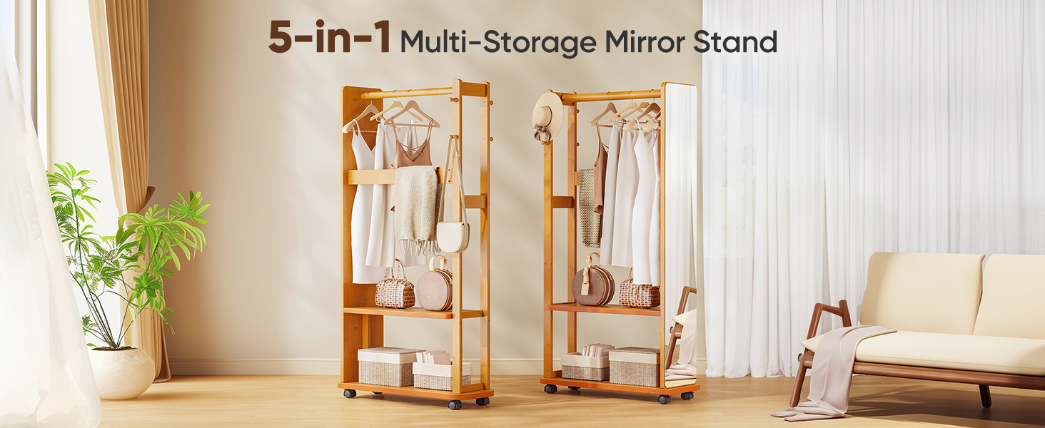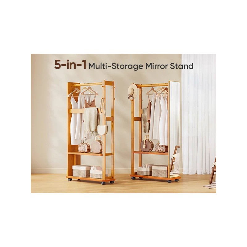 5-in-1 Bamboo Full-Length Mirror with Storage – Multifunctional Standing Mirror for Living Room Bedroom Entryway Description: 🌟 Key Features: