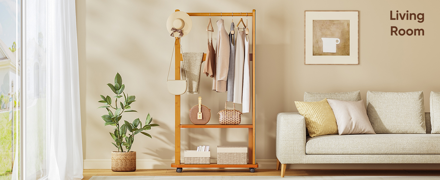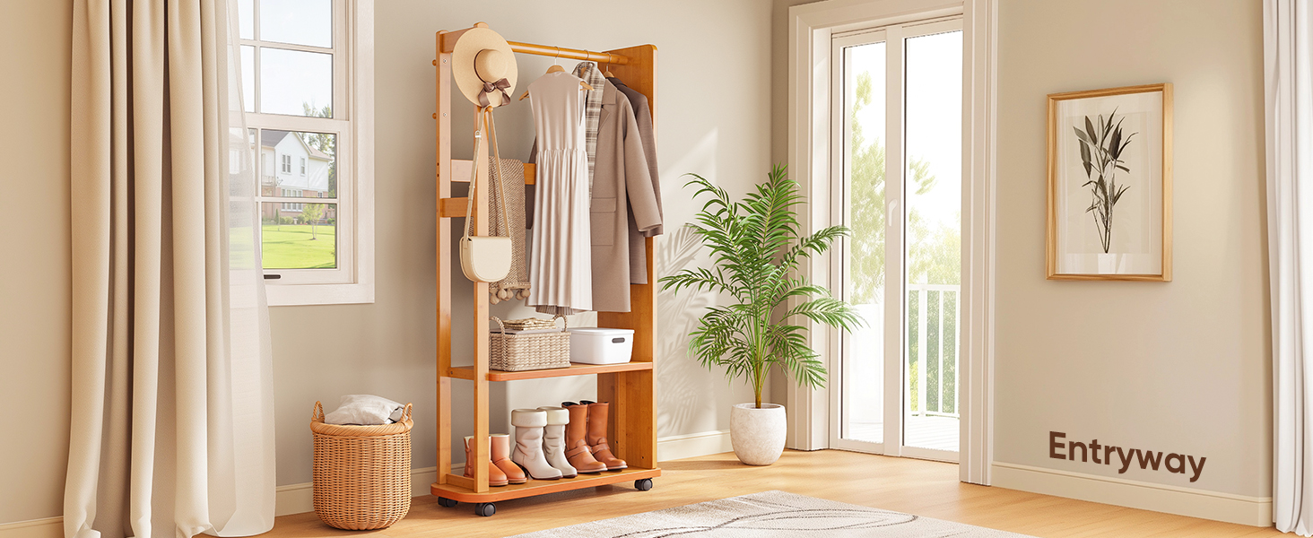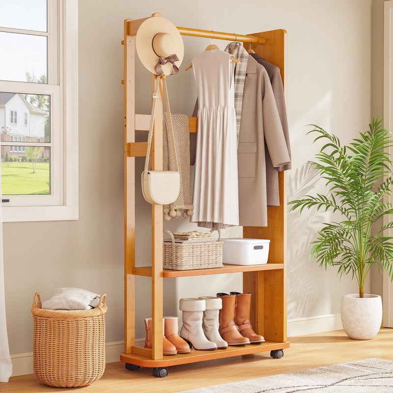 Verinch Bamboo Hall Tree Storage Stand w/ Full Body Mirror Wheel Stylish Coat Rack Brown