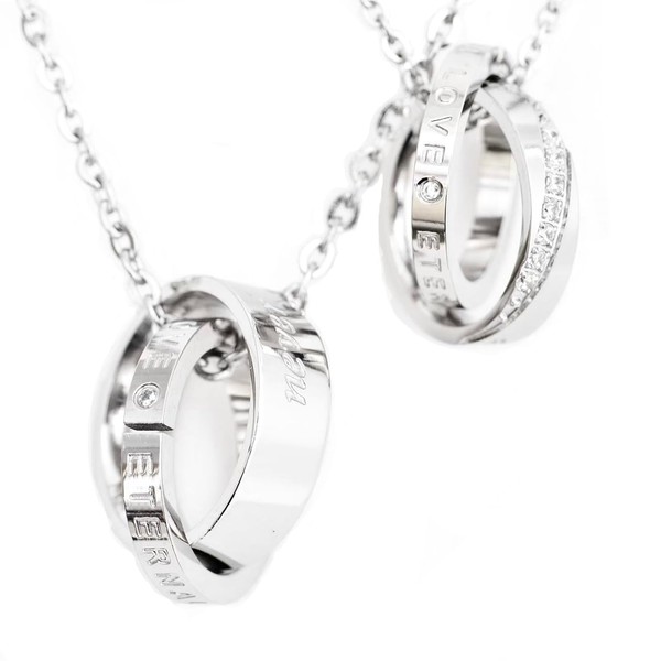 - Simple Double Ring Pair Necklace: This double ring necklace is attractive in 3D form that looks beautiful from anywhere. Engraved with a matching message and sparkling stone design, it brings out a mature charm that is simple yet upgrade. The two overlapping rings symbolize the eternal bond that never separates, making it a couple necklace that makes you feel the connection with your loved one