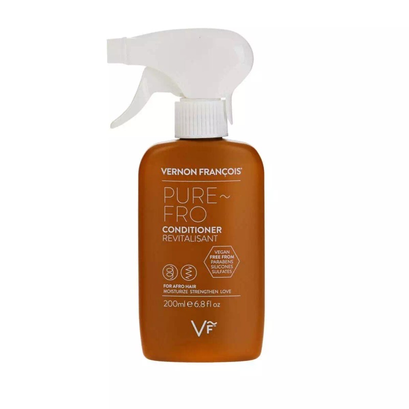 WHAT IT IS Wash out conditioner, in a spray bottle, for targeted and controlled application. 6.8 oz. Made in USA. WHAT IT DOES Conditions, moisturizes and detangles kinky, coily, afro hair after shampooing. HOW TO USE IT Shake before use. Turn the end of the nozzle to select stream or mist. Section your hair into four areas. Spray the conditioner evenly on mid-lengths to ends, then apply lightly to the roots on wet or dry hair. Work the conditioner in then rinse. For dry and damaged hair leave in for five minutes. For best results use with PURE~FRO® Shampoo.Vernon Francois Pure-Fro Conditioner Spray