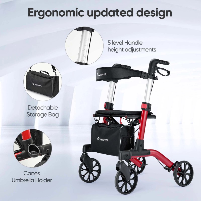VERPAL 2 in 1 Rollator Walkers for Seniors, Folding Rollator Walker with Seat 8" Wheels 350LB Capacity- Easy Folding Senior Walker with Backrest- Lightweight Mobility Walking Aid for Adult Elderly, Aluminum Frame Red