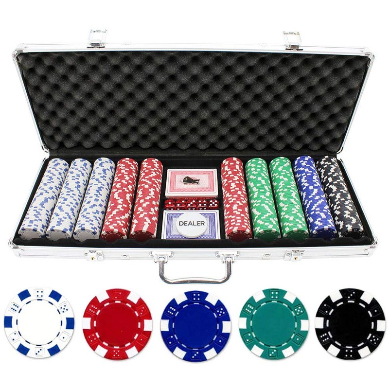 - Poker Chip Set includes an Aluminum Carrying Case, 2 Decks of Playing Cards, 5 Red Dice, and a Dealer Button