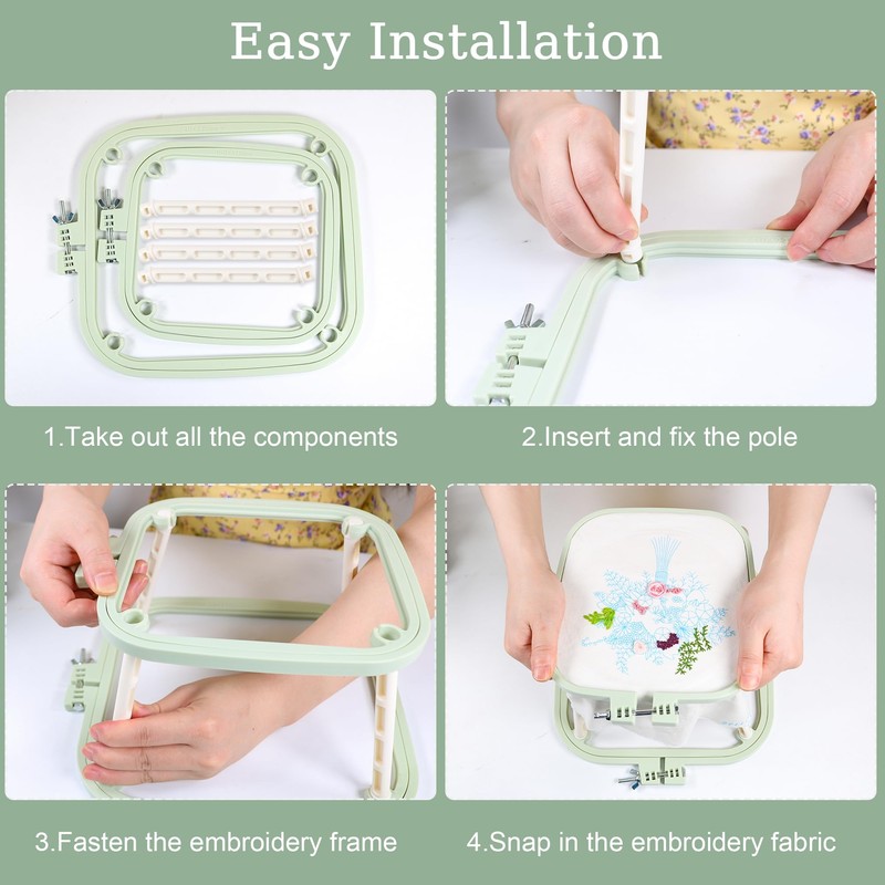- Unique Design: This double tier embroidery frame is consisted of a small square embroidery hoop, a big square embroidery hoop and 4 supporting rods, forming a stable trapezium structure,so it can firmly stand on the table, sofa and bed, making your embroidery process become easy and efficient.