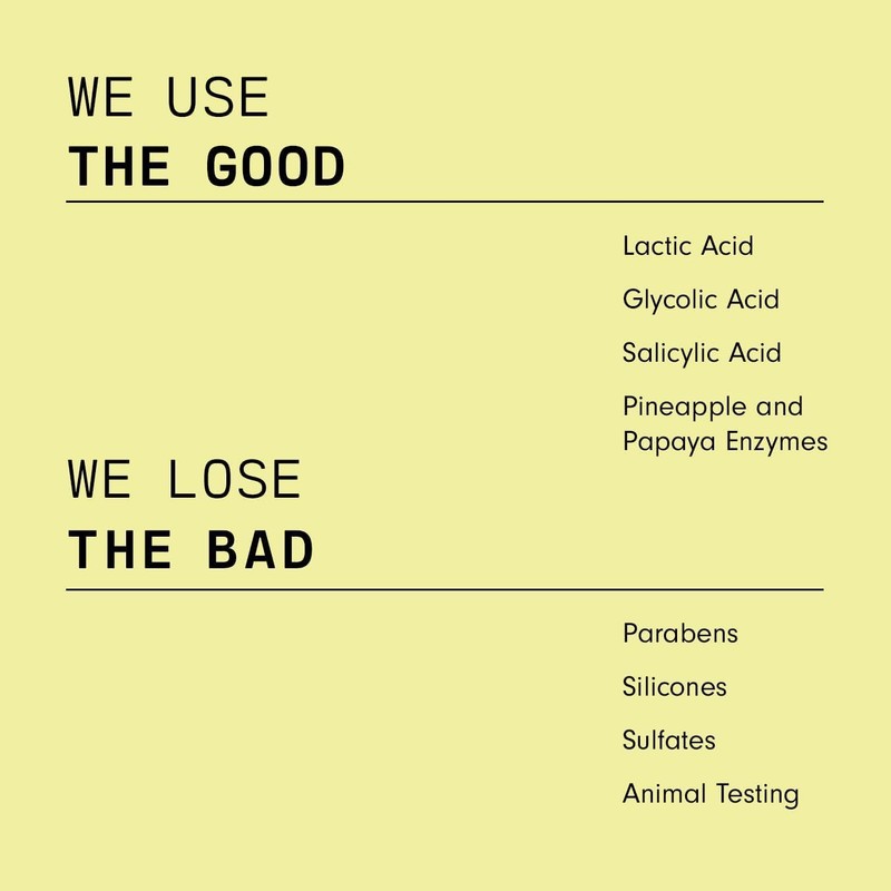 - Buildable Brightness - This instant glow is all thanks to vitamin C rich pineapple and papaya enzymes, which gently remove the outer layer of dead skin cells that trap bacteria, while moisturizing and softening skin. The best part? Watching the results build week after week.