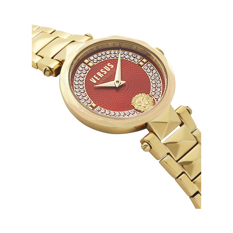 Versus Versace Covent Garden Collection Luxury Womens Watch Timepiece with a Gold Bracelet Featuring a Gold Case and Red Dial