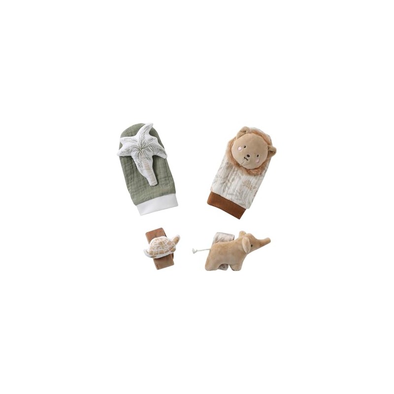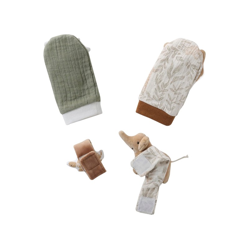 Bracelets: width adjustable with Velcro. 1 x soft velvet bracelet with relief turtle made of cotton fabric and bell inside. 1 x cotton muslin bracelet with velvet elephant on the top and bell inside.