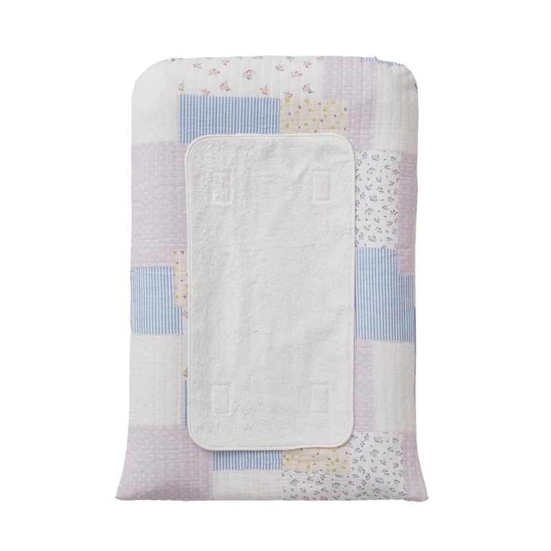 Patchwork effect cover. The patchwork pattern varies from cover to cover, each piece is unique. Removable 100% cotton mesh changing mat, not wired, PVC lined, Velcro fastening, cover closed by folding, cover machine washable