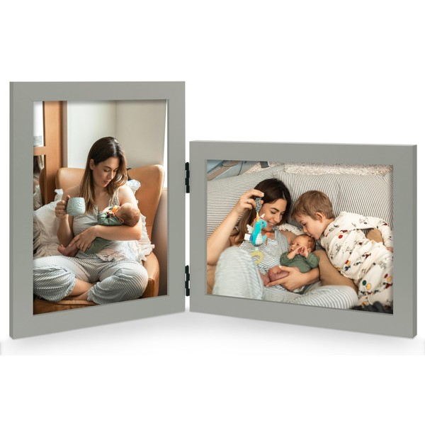 Vertical Horizontal Combo, Double 4x6 Grey Wood Foldable Picture Frame, Opening 3.5x5.5, Desktop or Wall Mounted, Portrait and Landscape View