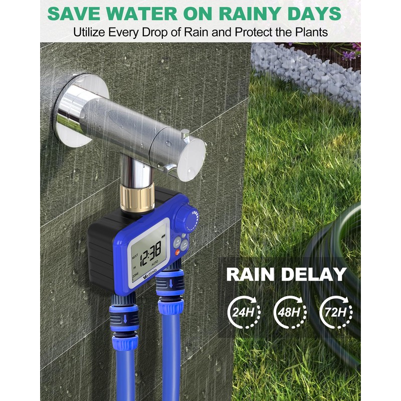 - 3 Manual Modes & Rain Delay - Our irrigation system for garden offers 3 separate manual modes, allowing you to conveniently switch between ZONE L, ZONE R, and BOTH ZONE using the "ZN" button. Customize the watering duration for each zone ranging from 1minutes-4h59 minutes according to your specific needs. Additionally, our hose timers feature a rain-delay function that can be set to skip watering for 24, 48, or 72 hours. This feature helps prevent overwatering and saves water on rainy days.