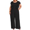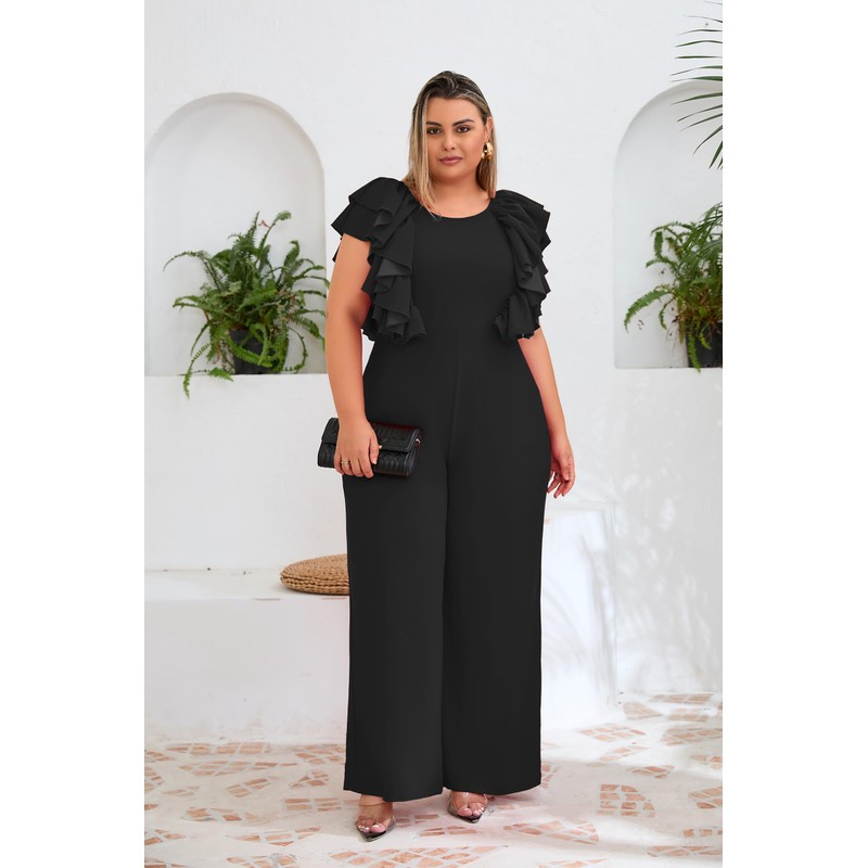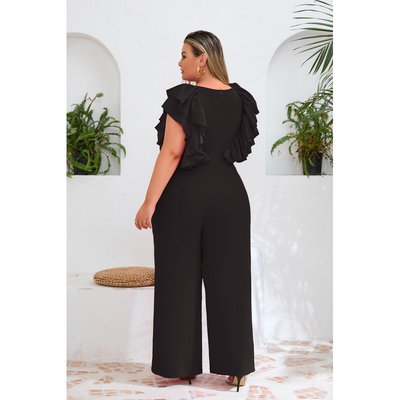 VERWIN Plus Size Ruffle Women's Jumpsuit Plain Full Length Romper Sleeveless Patchwork Overlay Jumpsuit with Pockets XXXL Black