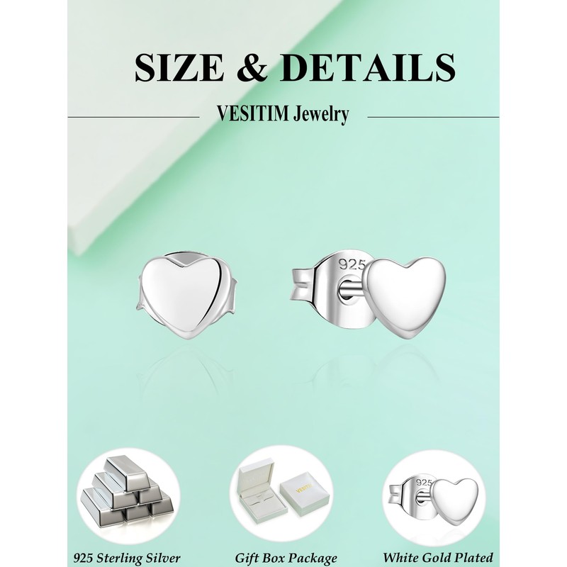 Vesitim 925 Sterling Silver Stud Women Heart Stud Earrings White Gold Small Earrings Jewelry