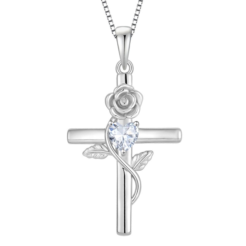 Vesitim Women's Cross Necklace 925 Sterling Silver Infinite Rose Flower Pendant Faith Religious Birthstone Jewelry Gift, Sterling Silver, Cubic Zirconia