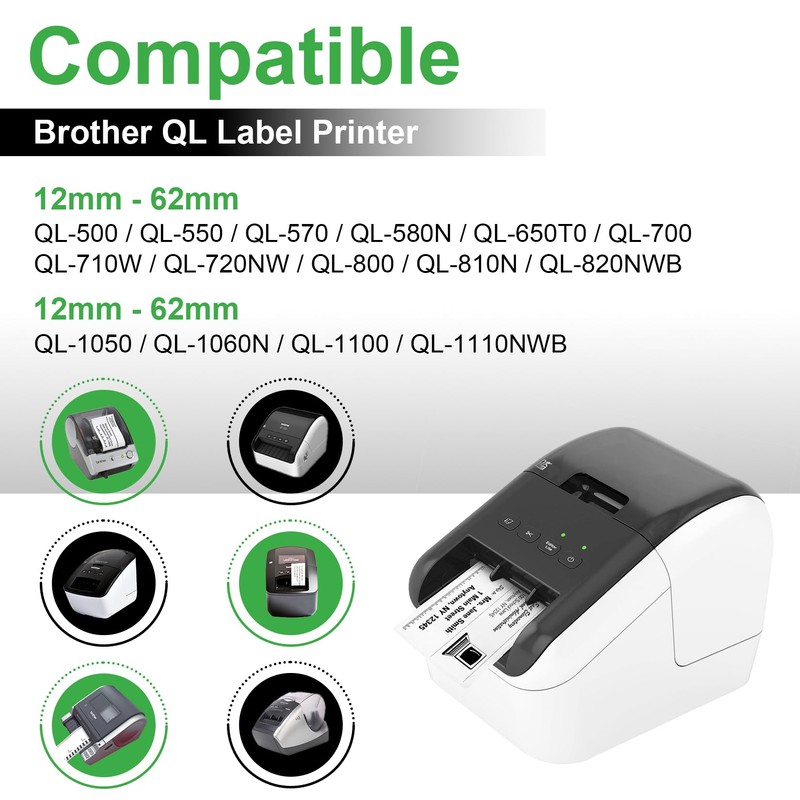 - Wide compatibility: Brother QL-500, QL-550, QL-570, QL-600, QL-650, QL-700, QL-720N, QL-800, QL-1050, QL-1060N, QL-1100, QL-1100W, QL-300, QL-310, QL-310, QL-330. 20, QL 710W, QL-720, QL-820NW, QL-890, QL-580N, QL-650TD, QL-810N, QL-820NWB, QL-1110NWB