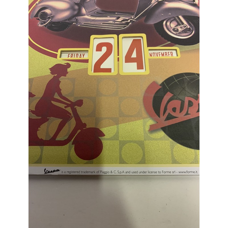 Great vintage wall mounted calendar with rotating dials to change the date. Check out our other great deals on new Vespa collectibles- thank you. Measures 14 1/2” x 10 1/2”.