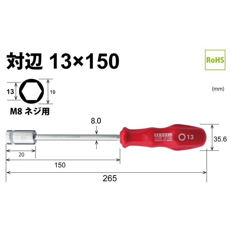 VESSEL 4100 Power Socket Screwdriver, Opposite Sides, 13 Hex Bolts and Nuts, For Tightening