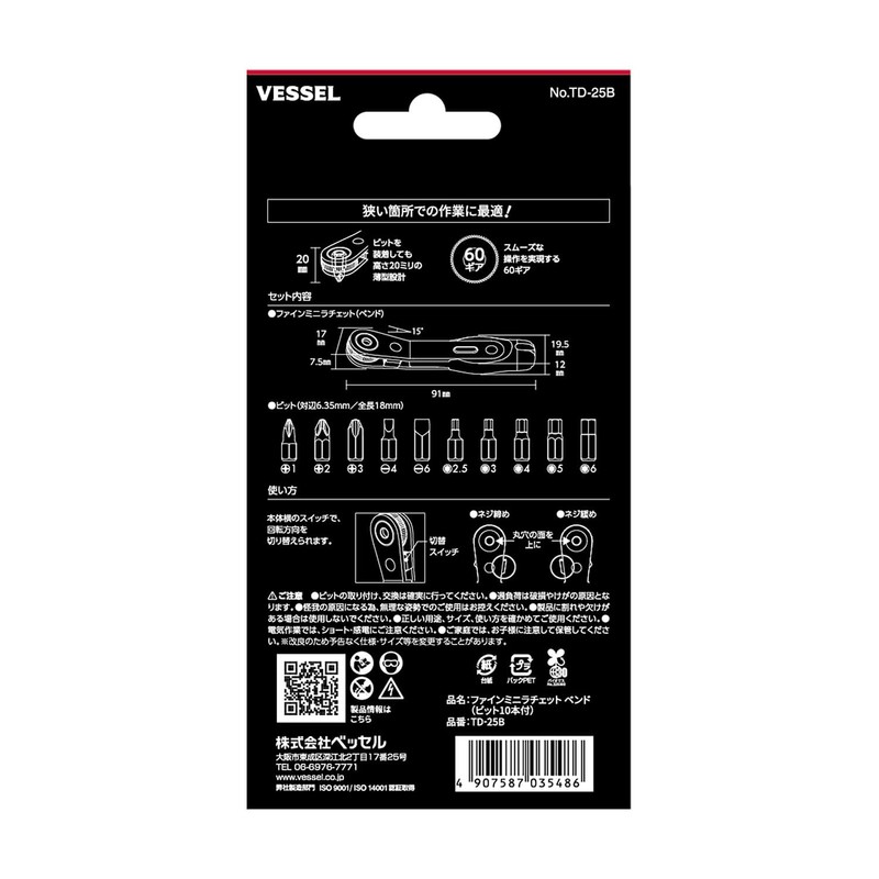 Vessel TD-25B Ultra Thin Fine Mini Ratchet Screwdriver Vent Type with 10 Bits