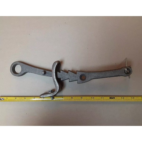 This piece usually comes with Vestal Cast-Iron Damper and is 12" in overall length. It consists of a catch piece that bolts to the damper frame, and a control arm which attaches to the damper plate with a cotter pin (provided). Moving the control arm regulates the width of the damper opening. The rotary control measures 19" and simply installs as shown.