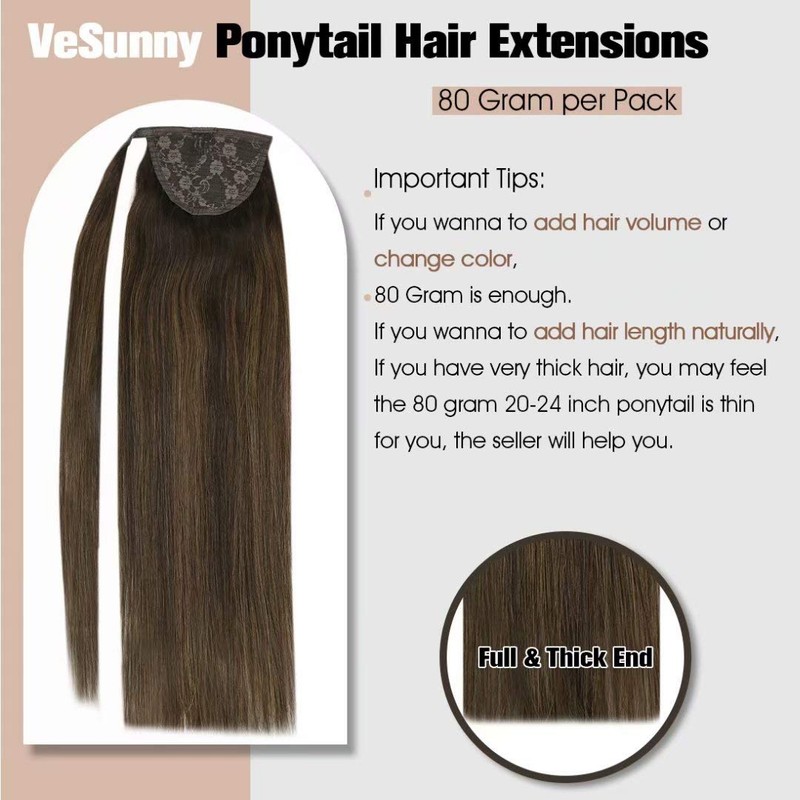 - 1. VeSunny wrap around 100% real human hair ponytail extensions: 80 gram per package. Can be straighten, curled and cutted. If you have very thin hair, maybe 80g is heavy for you. If you want a thicker hair, we also have 100g or heavier clip in ponytail hair extensions for you.