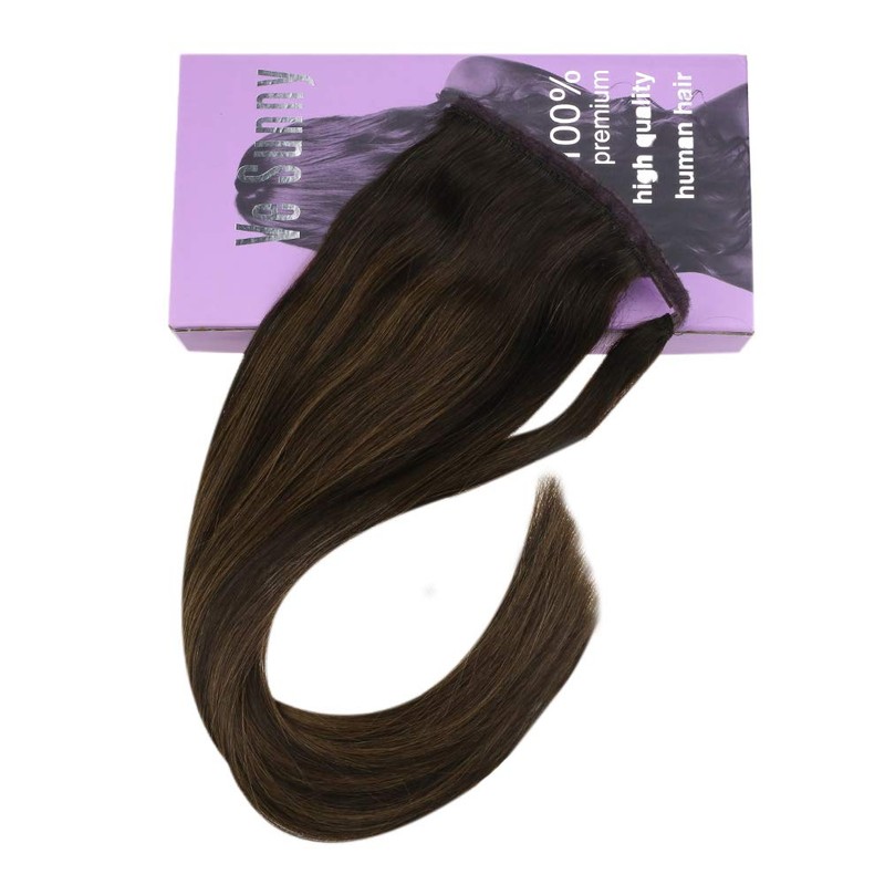 VeSunny Ponytail Human Hair Extension Dark Brown Ombre Chestnut Brown Balayage Wrap Around Pony Hair Piece Brazilian Hair Ombre Pony Tail Extensions 80g/pack 16inch