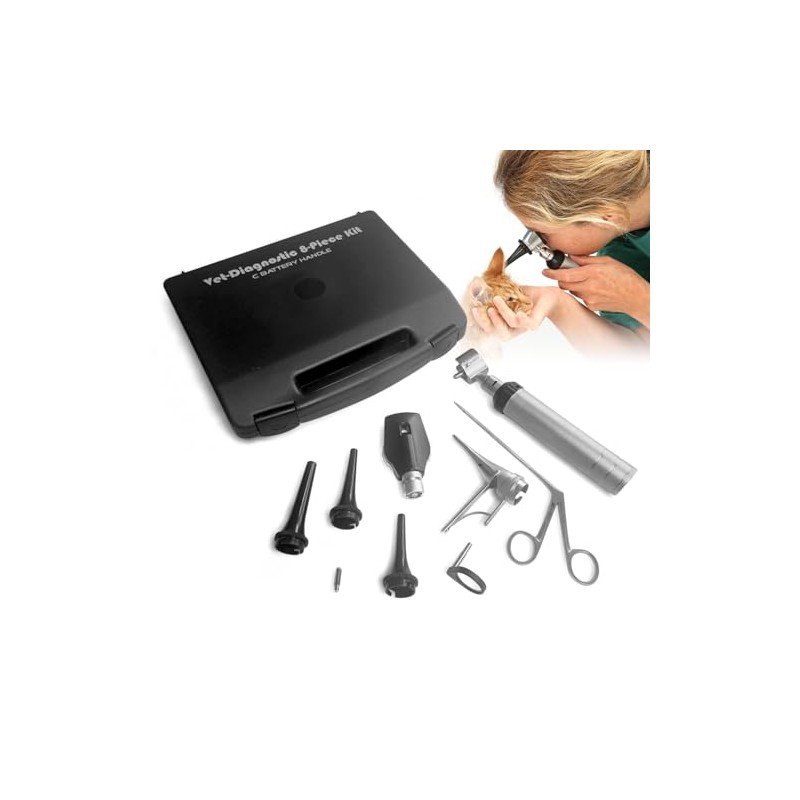 Vet-Otoscope with Ophthalmo-Scope Square Head 2 "C Battery Handle 8-Pcs Kit with Black Plastic Box