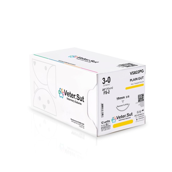 Veterinary Sutures - VeterSut Plain Gut Absorbable Surgical Suture USP Size 3-0, (FS-2) 3/8 19mm Reverse Cutting Needle, 28 Inches (70 cm), 12 Count, Veterinary Use