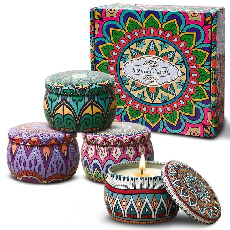 VETOUR Soy Scented Candles Gift:Pack of 4 Gardenia Jasmine Lavender Osmanthus 4.4OZ 30 * 4 Hours Aromatherapy Tin Can Candles Set Relaxing Stress Aroma Jar for Women Home Bath Yoga(Bohemian Retro)