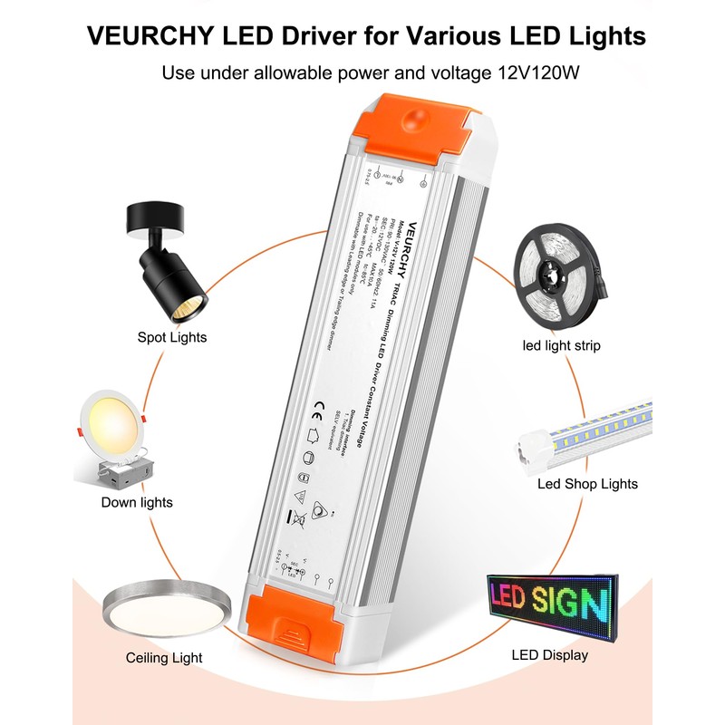 - Strong compatibility and widely use: The VEURCHY 120W 12v dimmable led driver is compatible with Lutron & Leviton Switches, ensuring easy integration into your home or office lighting. Suitable for various 12V LED lighting applications and under cabinet lighting, such as led strip lights, light bulbs, pendant lights, ceiling lights and linear lights