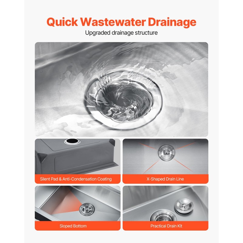 - Optimized Drainage System: This bar kitchen sink workstation features an upgraded X-shaped drain line and a sloped bottom, ensuring fast water drainage while preventing water accumulation. And the included strainer basket effectively catches food debris, making drainage convenient and cleanup effortless.