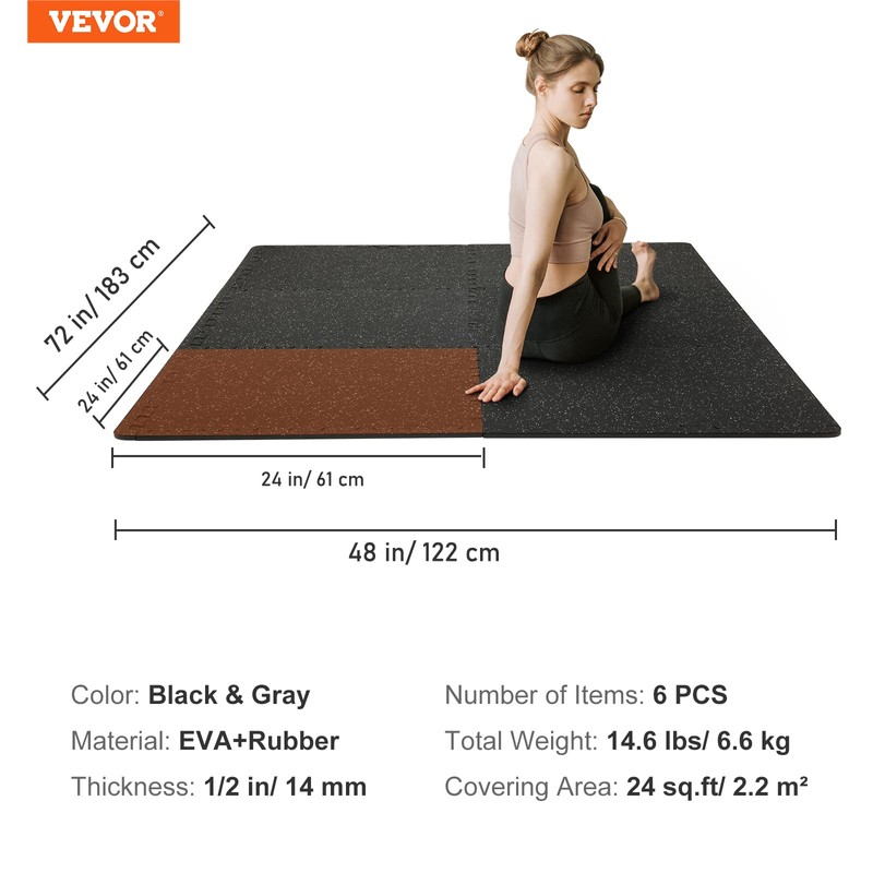 VEVOR 6 PCS 1/2 inch Thick Gym Floor Mats, 24" x 24" EVA Foam & Rubber Top Interlocking Workout Floor Mats with 24 sq.ft Coverage, Waterproof Exercise Puzzle Flooring for Gym, Home, Garage, Basement