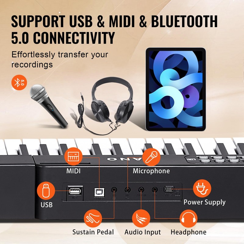 - Supports Bluetooth 5.0, USB & MIDI Connectivity: Equipped with a sustain pedal input, audio input, headphone jack, microphone input, USB port, and MIDI transmission, this digital keyboard piano offers seamless integration with computers, tablets, sustain pedals, and more. Enjoy versatile connectivity options to enhance your musical experience.